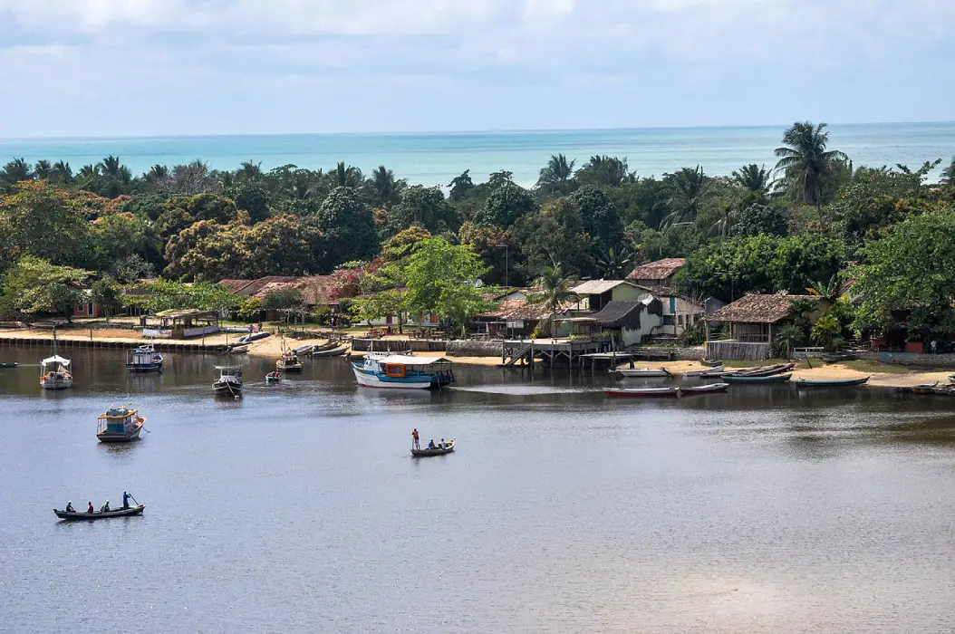 Vista aérea da charmosa Vila de Caraíva na Bahia, mostrando o encontro do rio (Rio Caraíva) em primeiro plano com o mar azul no horizonte. Na margem do rio, é possível ver casas rústicas, muita vegetação tropical, e pequenas canoas e barcos de pesca atracados ou navegando.